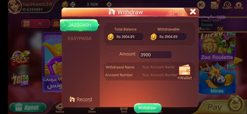 This app isn’t just about Teen Patti — you can also enjoy Zoo Roulette, Ruolette , Fortune, Poker, Ludo, Dragon Tiger, Mines, Slots and many other popular games. Compete in seasonal tournaments, invite friends to earn extra bonuses, and withdraw your winnings instantly through Easypaisa or JazzCash.